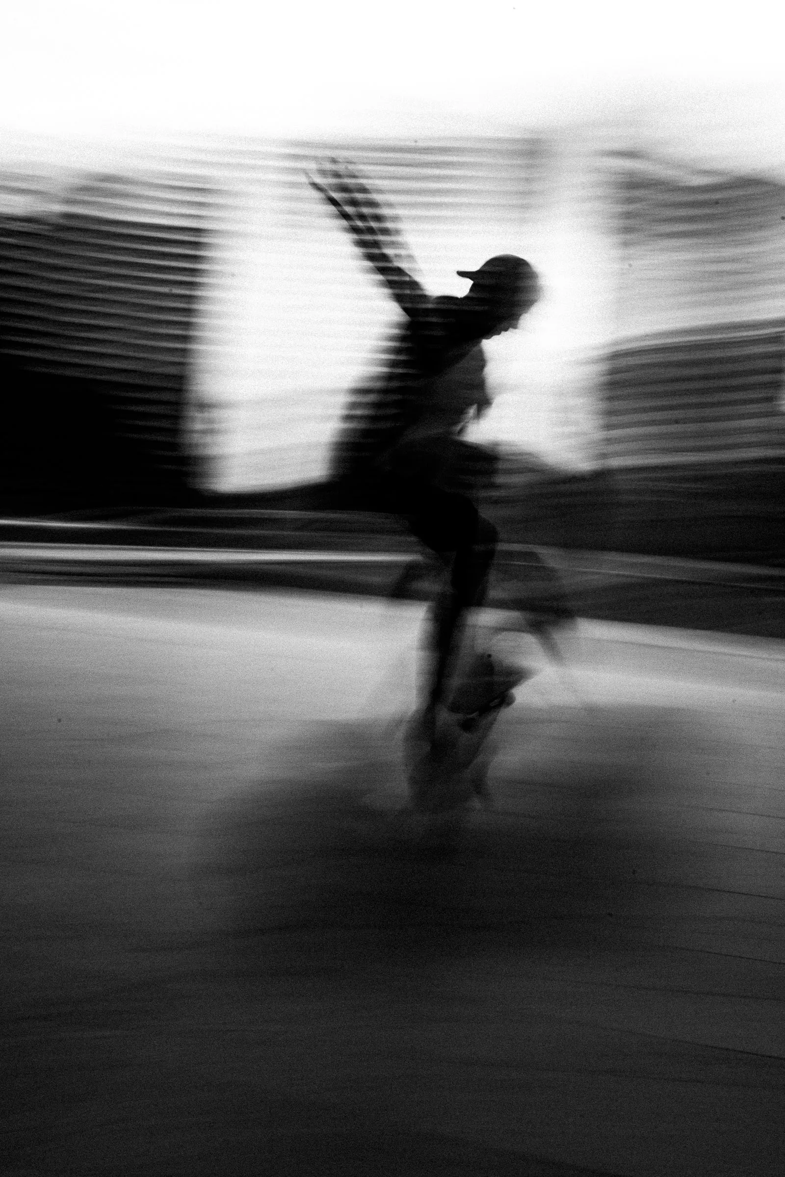 Shooting directly down through the floors of a heritage stairwell, the repeating geometry of banisters and treads creates a layered, disorienting depth. A blurred figure moves through the frame below, caught in descent.